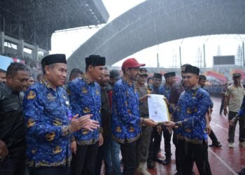 Gambar: Gubernur Aceh Muzakir Manaf (bertopi merah) menyerahkan dokumen keputusan secara simbolis kepada perwakilan Pegawai Pemerintah dengan Perjanjian Kerja (PPPK)...