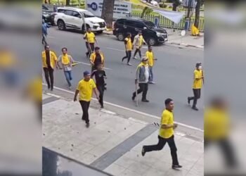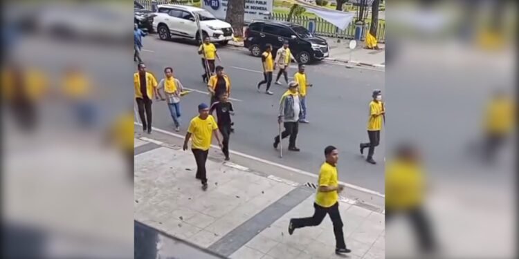 Read moreDetailsGambar: Sejumlah massa yang mengenakan atribut kaus berwarna kuning khas partai terlihat berlarian dan membawa benda tumpul berupa kayu di...
