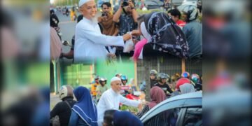 Read moreDetailsGambar: Wali Kota Dumai, H. Paisal, yang mengenakan pakaian muslim putih dan peci tampak tersenyum hangat saat membagikan langsung bingkisan...