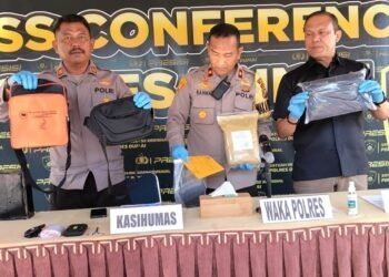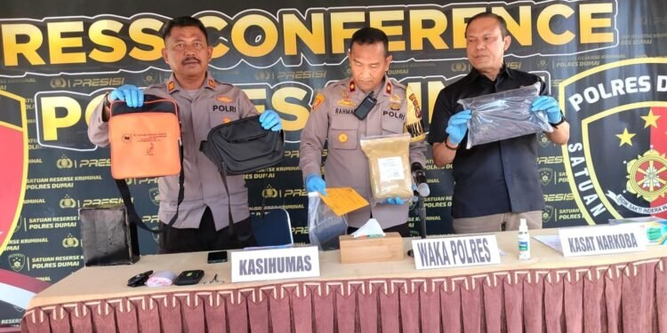 Read moreDetailsGambar: Wakapolres Dumai, Kompol Rahmat (tengah), didampingi Kasat Narkoba (kanan) dan Kasi Humas (kiri) memperlihatkan barang bukti sabu dan tas...