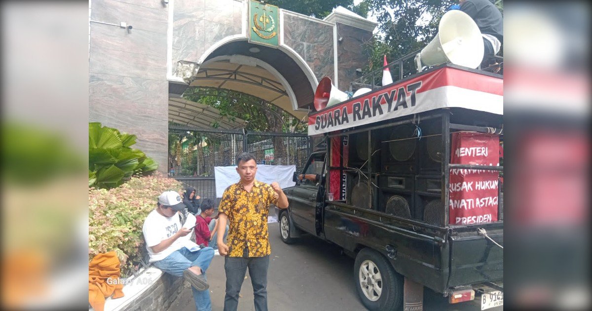 Gambar: Suasana aksi damai yang digelar oleh aktivis Sumatera Selatan di depan gerbang Kejaksaan Agung RI, Jakarta, Jumat (28/11/2025). Tampak mobil komando dengan spanduk “SUARA RAKYAT” dan poster tuntutan berwarna merah terparkir di depan pintu gerbang, sementara seorang perwakilan massa melakukan orasi mendesak penuntasan kasus dugaan korupsi program SERASI Banyuasin.