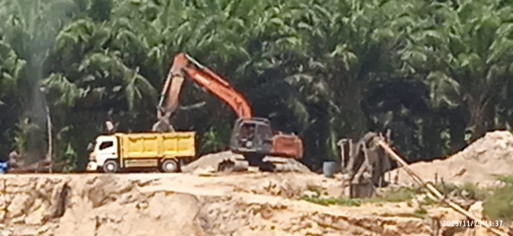 Gambar: Sebuah alat berat ekskavator berwarna oranye terlihat sedang melakukan aktivitas pemuatan material tanah ke dalam truk (dump truck) berwarna kuning di area terbuka yang dikelilingi pepohonan sawit. Aktivitas ini diduga merupakan bagian dari operasi penambangan Quarry atau galian C di Desa Kualu, Kabupaten Kampar, yang terpantau masih berlangsung aktif.