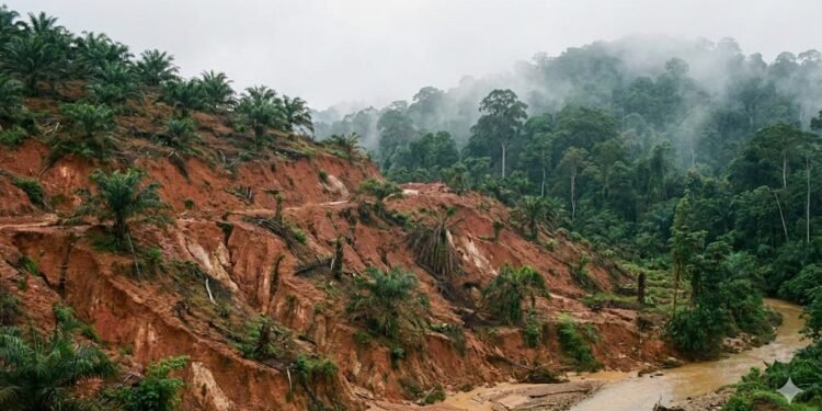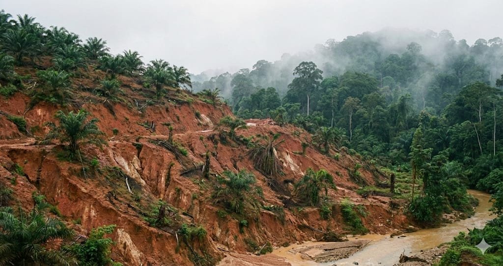 Gambar: Ilustrasi sebuah lanskap perkebunan di lereng bukit terjal yang mengalami erosi tanah, kontras dengan hutan alami di latar belakang yang berkabut, menggambarkan ketidaksesuaian lahan untuk monokultur sawit.