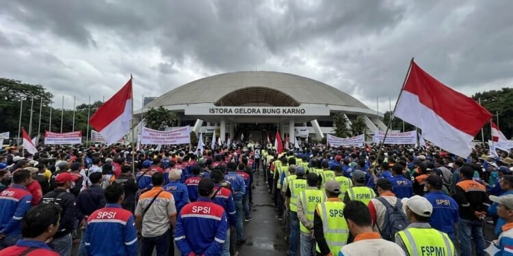 Gambar: Ilustrasi massa buruh dengan seragam serikat pekerja memadati depan gedung Istora Senayan Jakarta, suasana mendung dramatis, bendera merah putih berkibar. (Dok. UtusanRakyat/AI)