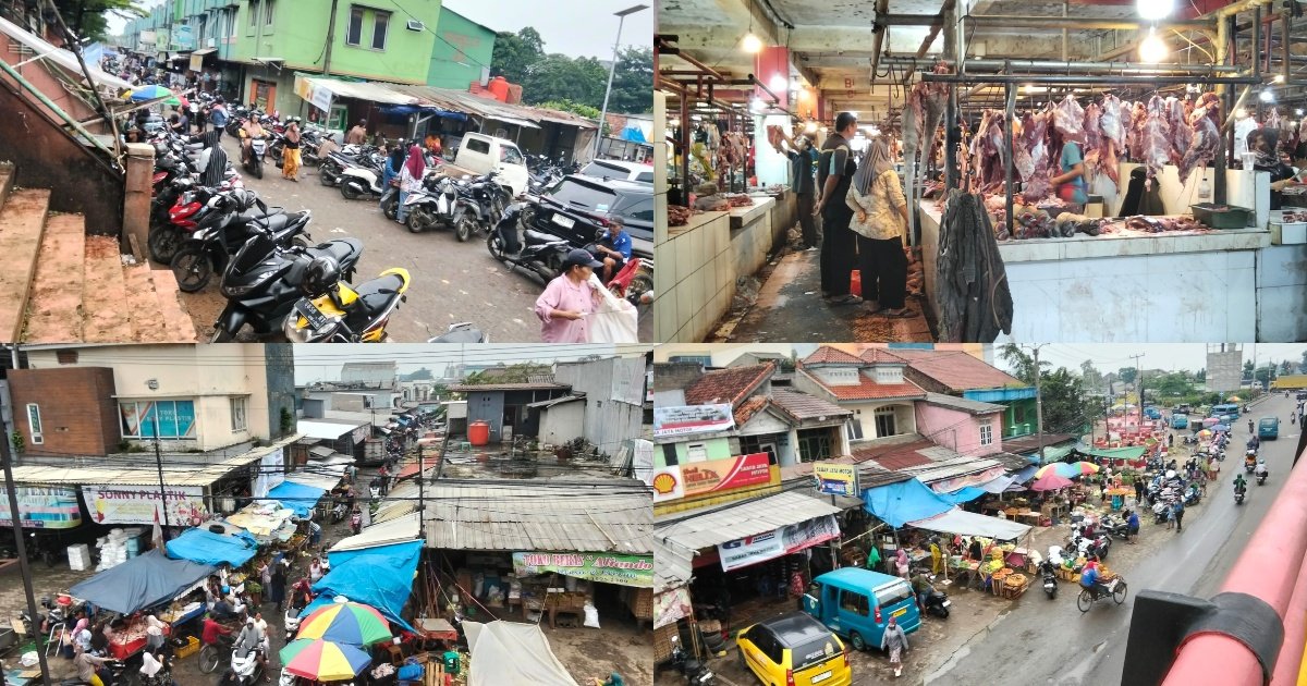 Gambar: Kolase foto yang memperlihatkan suasana keramaian di Pasar Cileungsi, mencakup area parkir motor yang padat, aktivitas pedagang daging sapi yang sedang melayani pembeli, pemandangan udara lapak pedagang dengan payung warna-warni, serta hiruk-pikuk lalu lintas angkutan umum dan warga di sekitar area pasar.