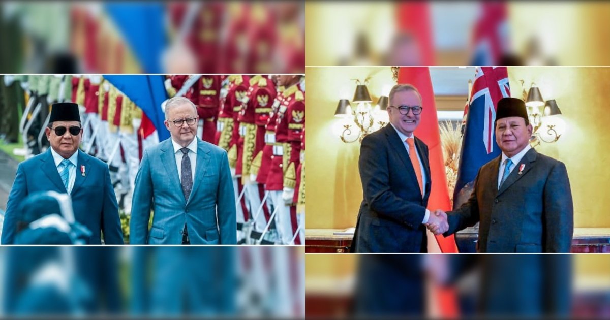 Gambar: Prabowo Subianto dan Perdana Menteri Australia Anthony Albanese tampak berdampingan dalam upacara kenegaraan dan berjabat tangan di hadapan bendera Indonesia dan Australia, menggambarkan eratnya hubungan kerja sama pertahanan dan keamanan kedua negara.