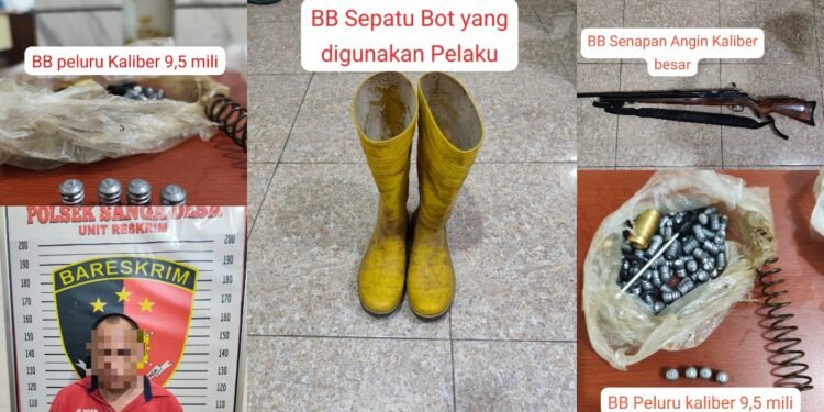 Gambar: Kolase foto menunjukkan barang bukti yang diamankan petugas dari terduga pelaku pembunuhan di Sanga Desa, Kabupaten Musi Banyuasin. Tampak peluru kaliber 9,5 milimeter dalam kemasan plastik (kiri bawah dan kanan bawah), sepasang sepatu bot berwarna kuning yang digunakan pelaku (tengah), dan senapan angin kaliber besar (kanan atas) yang digunakan untuk menembak korban. Foto disertai watermark Polsek Sanga Desa Unit Reskrim dan logo Bareskrim Polri, menunjukkan bukti pengungkapan kasus yang melibatkan seorang PNS dan anaknya yang membunuh nelayan pencuri sawit.