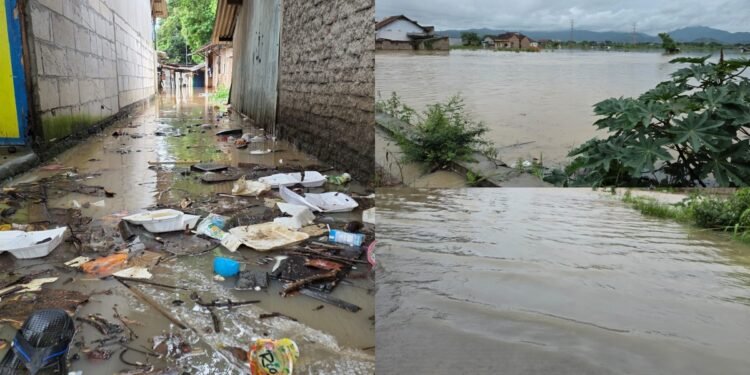 Gambar: Kolase foto kondisi banjir yang melanda Kota Cilegon; sisi kiri memperlihatkan gang sempit di kawasan permukiman yang tergenang air keruh penuh sampah plastik dan styrofoam, mengindikasikan sumbatan drainase, sedangkan sisi kanan menampilkan lanskap permukiman warga dan area terbuka yang terendam banjir dengan debit air cukup tinggi akibat curah hujan ekstrem.