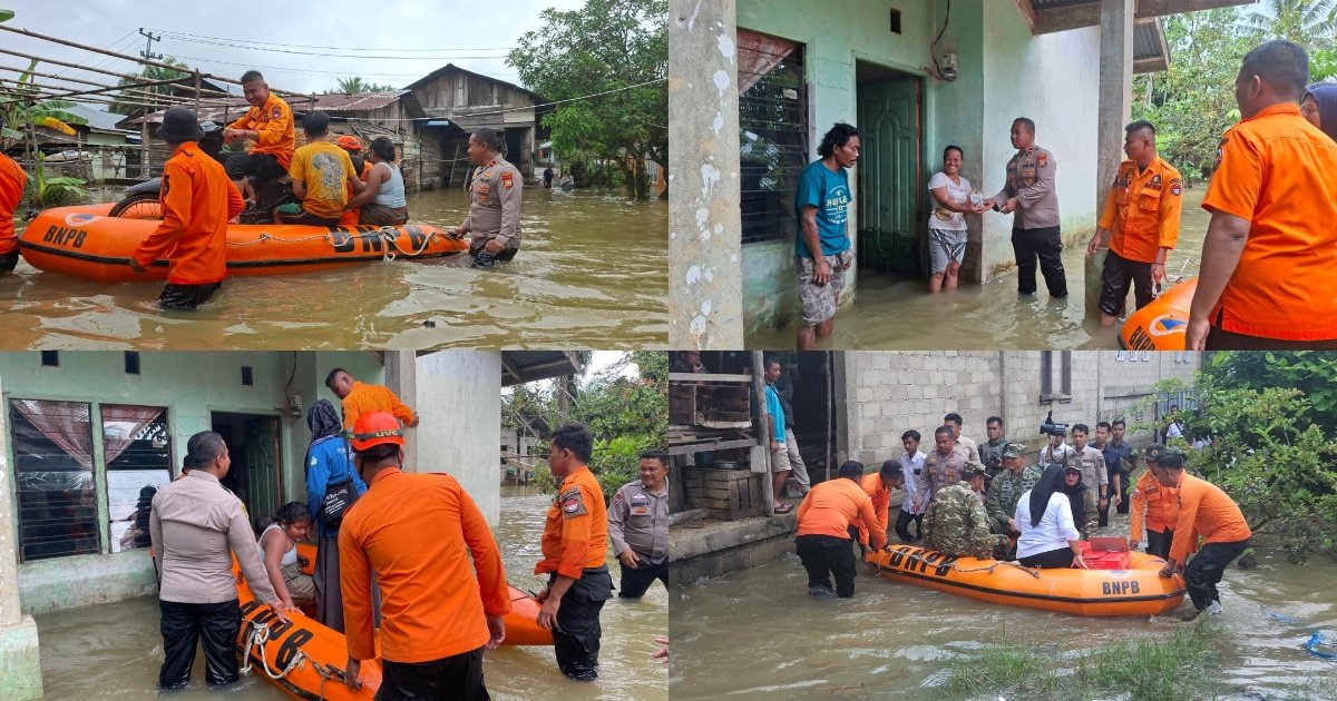 Gambar: Personel Polsek Bangkinang Barat bersama tim penanggulangan bencana menggunakan perahu karet berlogo BNPB untuk mengevakuasi dan membantu warga yang rumahnya terendam banjir di Desa Silam, Kecamatan Kuok, Kabupaten Kampar, Rabu (10/12/2025).
