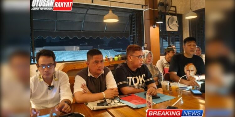 Gambar: Sejumlah perwakilan pedagang Pasar Induk Jakabaring dan kuasa hukum mereka menggelar pertemuan bersama awak media di Palembang, membahas tanggapan atas pernyataan PT Swarnadwipa Selaras Adiguna (SSA) terkait polemik pengelolaan pasar. Suasana diskusi terlihat serius dengan berkas-berkas tuntutan dan dokumen resmi di atas meja.