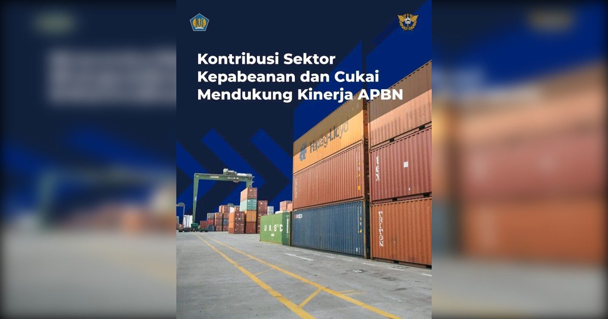 Gambar: Ilustrasi tumpukan kontainer kargo di area pelabuhan yang merepresentasikan aktivitas ekspor impor sebagai sektor vital dalam kontribusi kepabeanan dan cukai untuk mendukung kinerja Anggaran Pendapatan dan Belanja Negara (APBN), disertai logo Kementerian Keuangan dan Bea Cukai.