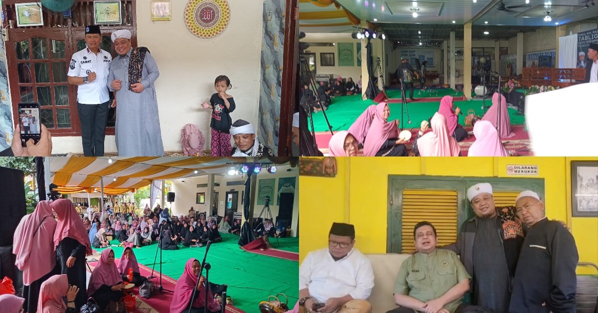 Gambar: Kolase foto kegiatan peresmian Pondok Pesantren Ard Al Arislah di Cileungsi. Kiri atas menampilkan Camat Cileungsi Adi Henryana bersalam komando dengan KH Raden Tatang Tajudin disaksikan seorang anak kecil. Kanan atas dan kiri bawah memperlihatkan suasana majelis yang dipadati ratusan jamaah ibu-ibu berbusana muslim nuansa merah muda dan hitam duduk lesehan di atas karpet hijau mendengarkan tausiyah. Kanan bawah menampilkan pose bersama tokoh masyarakat dan ulama, termasuk Abah Jamesbon, dengan latar belakang dinding kuning.