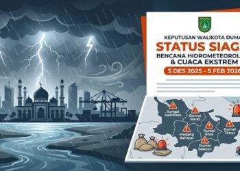 Read moreDetailsGambar: Ilustrasi Kota Dumai diguyur hujan lebat disertai kilat dan petir dengan latar bangunan ikonik serta pelabuhan, berdampingan dengan infografik...