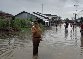 Gambar: Camat Koto Tangah, Fizlan Setiawan, S.STP., M.M., saat meninjau langsung kondisi banjir yang merendam permukiman warga di Kelurahan Dadok...