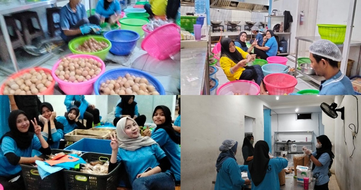 Gambar: Kolase foto aktivitas di Dapur MBG 02 Cileungsi yang memperlihatkan para petugas berseragam biru sedang menyiapkan paket makanan bergizi. Tampak proses pengupasan ribuan butir telur rebus, pengemasan berbagai jenis makanan ringan, serta suasana kesibukan di dapur umum yang bersih dan terorganisir untuk persiapan distribusi.