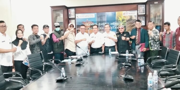 Gambar: Sejumlah perwakilan koalisi organisasi masyarakat dan aktivis berfoto bersama pejabat Dinas Energi dan Sumber Daya Mineral (ESDM) Provinsi Sumatera Selatan dengan latar belakang spanduk bertuliskan Transisi Energi Menuju Sumatera Selatan Mandiri Energi, usai melakukan audiensi terkait dugaan pelanggaran hukum perusahaan tambang di Kabupaten Musi Banyuasin, Palembang, Rabu (28/1).