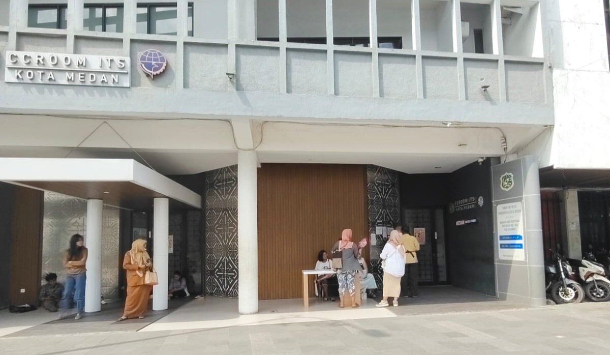 Gambar: Sejumlah warga berkumpul di depan pintu masuk Kantor Disdukcapil Kota Medan yang berlokasi di Gedung ATCS Dinas Perhubungan Lapangan Merdeka untuk mengurus administrasi kependudukan. Tampak beberapa warga sedang berinteraksi dengan petugas di meja pelayanan luar gedung yang memiliki aksen dinding kayu dan ornamen motif etnik di sisi pintu masuk, sementara di bagian atas gedung terpampang papan nama CCROOM ITS Kota Medan.