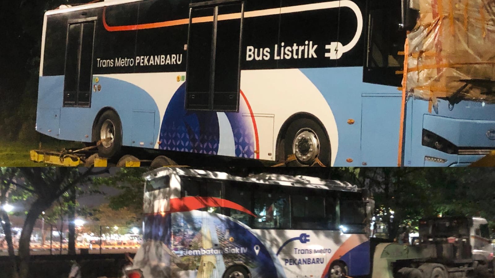 Menurut salah seorang petugas Terminal AKAP Pekanbaru, “Dua bus listrik Transmetro ini baru tiba malam ini. Nanti, kami akan masukkan ke dalam terminal untuk diuji coba,” sambil menunggu kedatangan Kepala UPT Transmetro Pekanbaru.