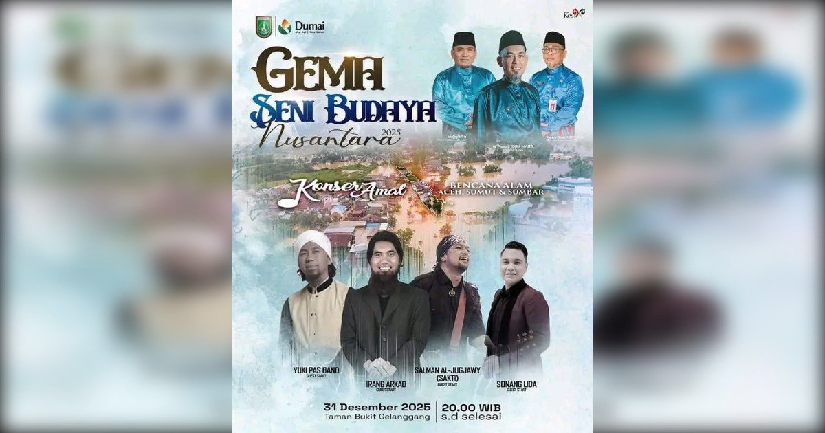 DUMAI (Utusan Rakyat) – Menutup lembaran tahun 2025, Pemerintah Kota (Pemko) Dumai menggelar aksi kemanusiaan akbar malam nanti (31/12) bertajuk “Gema Seni Budaya Nusantara 2025”. Acara yang dikemas dalam bentuk konser amal ini ditujukan untuk menggalang donasi bagi korban bencana alam banjir lumpur yang melanda tiga provinsi tetangga: Aceh, Sumatera Utara, dan Sumatera Barat.