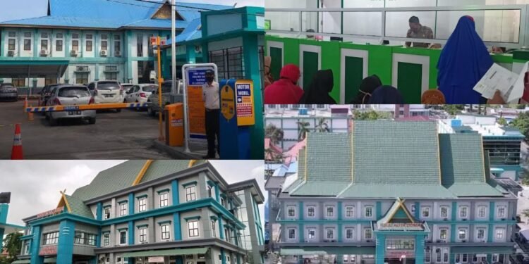 Gambar: Kolase foto yang menampilkan suasana dan fasilitas RSUD Kota Dumai, terdiri dari gerbang masuk utama dengan pos keamanan, aktivitas pelayanan administrasi kepada pasien di loket bagian dalam, serta tampilan eksterior gedung bertingkat dengan arsitektur atap limas khas Melayu berwarna hijau dan biru.