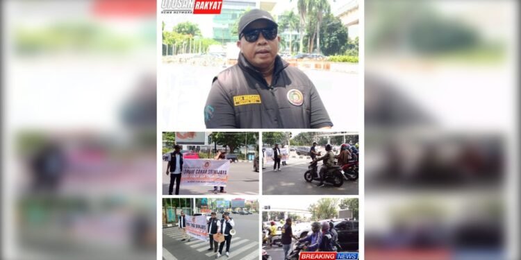Gambar: Ketua DPC Forum Cakar Sriwijaya Kota Palembang, Edi Medan (atas), memimpin aksi penggalangan dana kemanusiaan untuk korban banjir bandang dan tanah longsor di Aceh, Sumatera Utara, dan Sumatera Barat di Simpang Lima DPRD Provinsi Sumatera Selatan, Senin (01/12/2025). Tampak anggota forum membentangkan spanduk bertuliskan “Peduli Banjir dan Tanah Longsor #PrayForBumiPertiwi” serta mengumpulkan donasi dari pengendara yang melintas sebagai bentuk solidaritas.