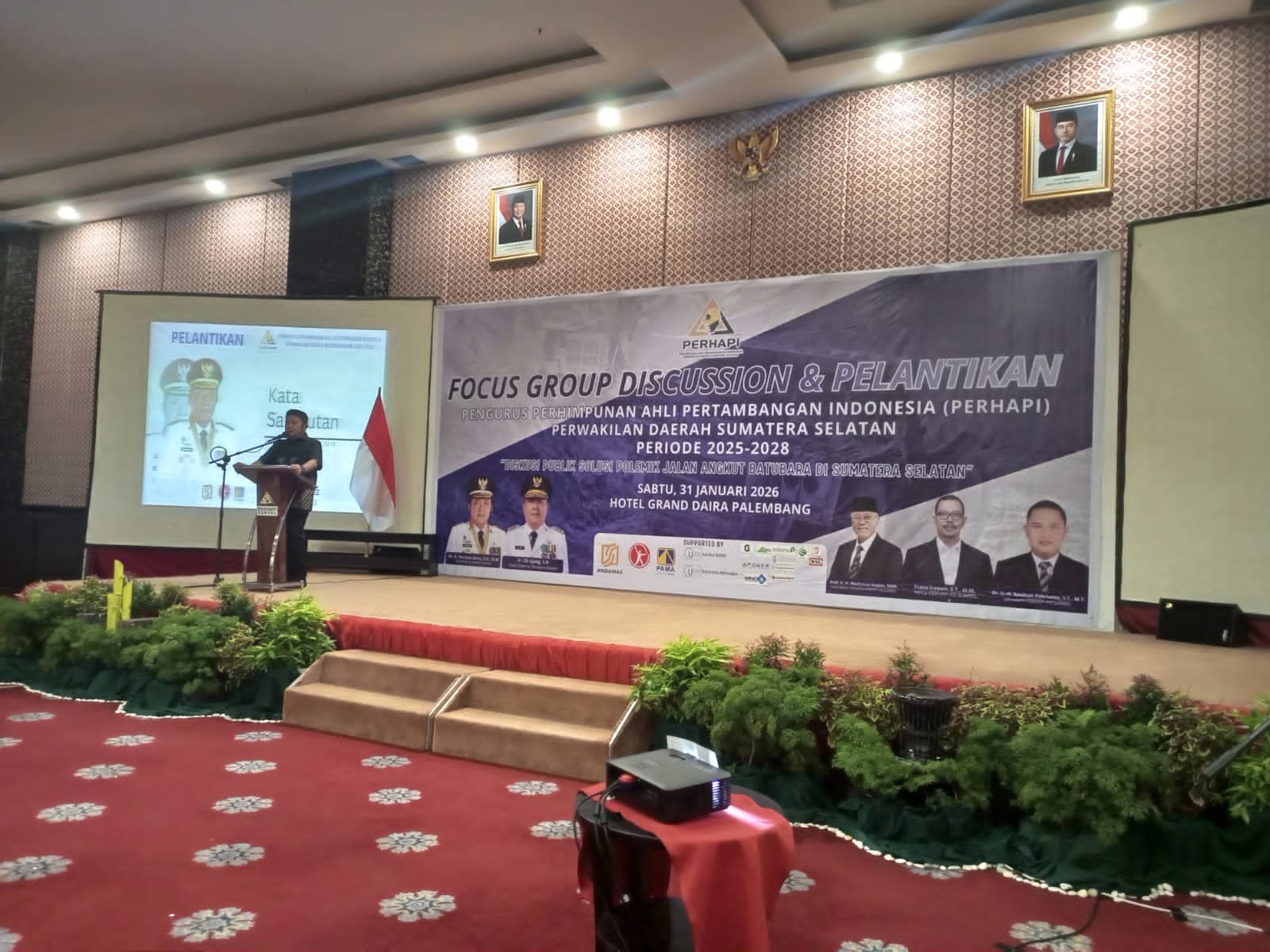 Gambar: Suasana panggung utama acara pelantikan pengurus Perhimpunan Ahli Pertambangan Indonesia (Perhapi) Perwakilan Daerah Sumatera Selatan periode 2025-2028 yang berlangsung di Hotel Grand Daira Palembang, memperlihatkan seorang pembicara di podium dengan latar belakang spanduk besar bertajuk Focus Group Discussion mengenai solusi polemik jalan angkut batu bara di wilayah tersebut pada Sabtu, 31 Januari 2026.