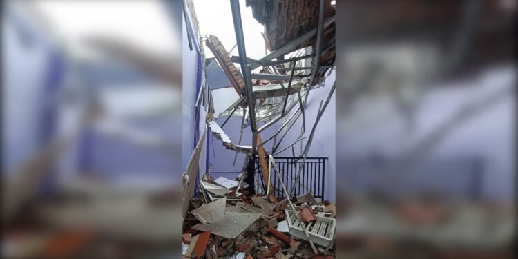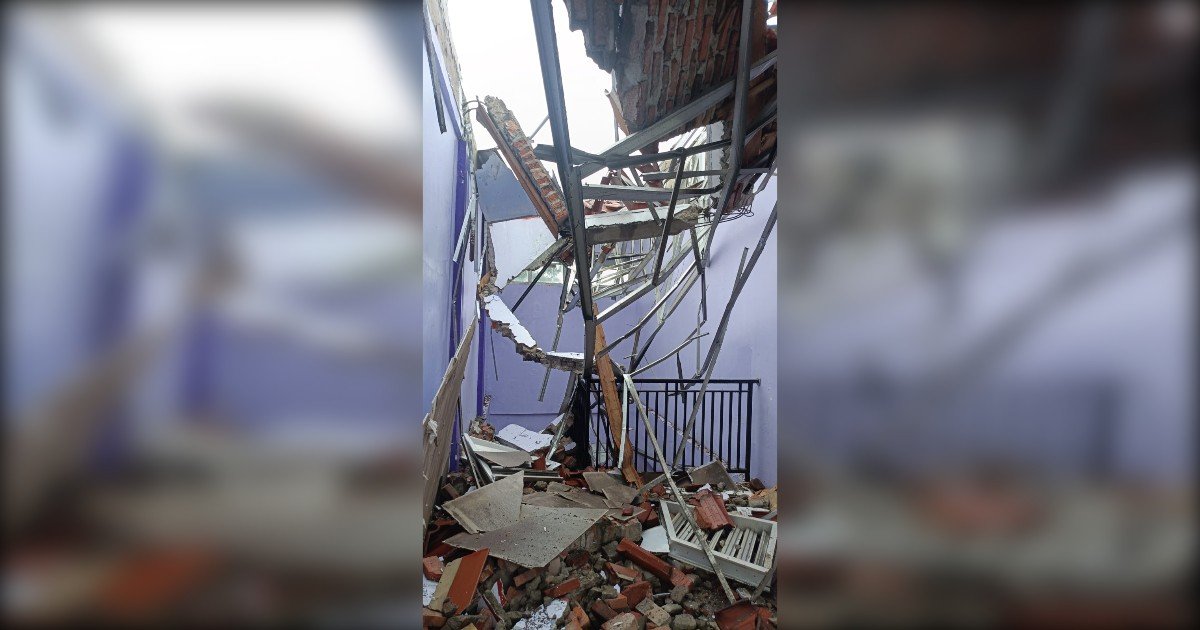 Gambar: Kondisi interior salah satu ruang kelas di SMAN 2 Gunungputri yang porak-poranda akibat atap yang roboh. Terlihat rangka atap baja ringan yang bengkok dan patah menjuntai ke bawah bersama dengan reruntuhan genteng tanah liat yang berserakan menutupi lantai. Struktur tembok berwarna ungu tampak masih berdiri, namun puing-puing material atap memenuhi ruangan, menggambarkan besarnya dampak kerusakan yang terjadi.