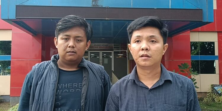 Gambar: Koordinator GEMAPELA, Sundan Wijaya (kiri), didampingi rekannya memberikan keterangan pers di depan Gedung SPKT Polda Sumatera Selatan usai melaporkan balik PT Bukitapit Ramok Senabing Energy terkait dugaan sengketa lahan di Kabupaten Lahat, Kamis (08/01/2026).