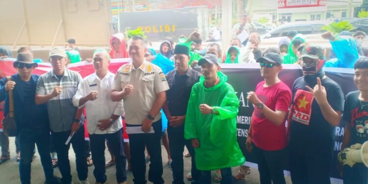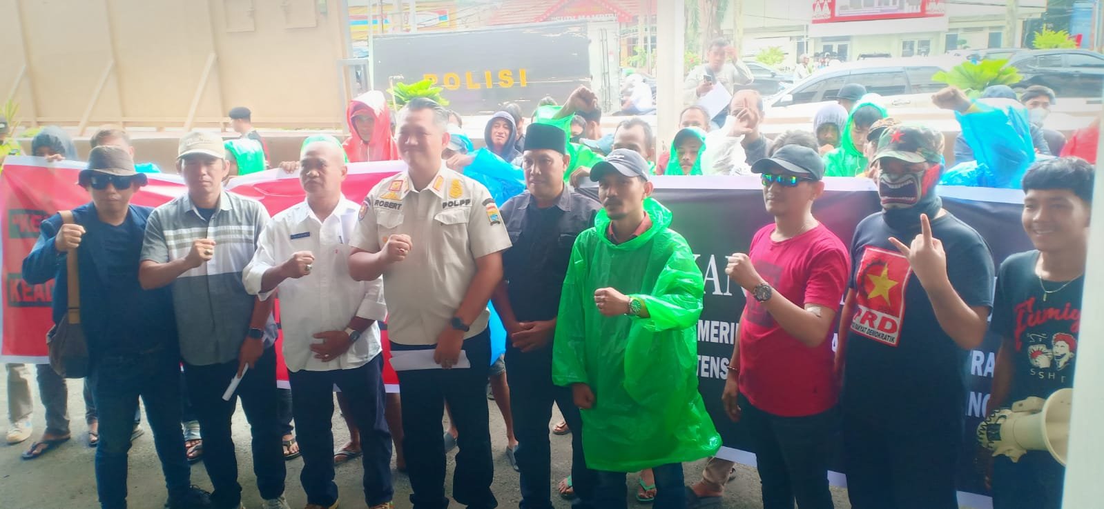 Gambar: Sejumlah perwakilan massa aksi dari GPK Sumsel berfoto bersama Kepala Bidang Linmas Satpol PP Kota Palembang, Robertus Edison Hendri (seragam dinas), di sela-sela aksi unjuk rasa mendesak realisasi pembangunan kolam retensi di depan Kantor Wali Kota Palembang, Rabu (14/1/2026).