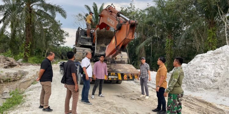 Gambar: Personel gabungan dari Satreskrim Polres Kampar bersama Babinsa Desa Sungai Pinang meninjau proses pengamanan satu unit alat berat ekskavator merek Hitachi yang disita dari lokasi penambangan ilegal di Desa Sungai Pinang, Kecamatan Tambang, Kabupaten Kampar.