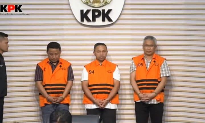 Gambar: Gubernur Riau Abdul Wahid (tengah, nomor 94) bersama dua tersangka lainnya, Kepala Dinas PUPR-PKPP Muhammad Arief Setiawan (kiri) dan Tenaga Ahli Gubernur Dani M. Nursalam (kanan, nomor 05), mengenakan rompi oranye khas tahanan KPK dengan tangan diborgol saat konferensi pers di Gedung Merah Putih KPK, Jakarta, Rabu (5/11/2025). Ketiga pejabat Pemerintah Provinsi Riau ini ditetapkan sebagai tersangka kasus dugaan pemerasan terkait “jatah preman” dalam penambahan anggaran di Dinas Pekerjaan Umum, Perumahan, Kawasan Permukiman, dan Pertanahan (PUPR-PKPP) Provinsi Riau.