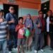 Gambar: Himawan Hadi Saputra didampingi istri, Puri Lindasari, yang menggendong putrinya, serta putranya berfoto bersama anak-anak Panti Asuhan Peduli Kasih yang mengenakan kemeja kuning dan peci putih serta pengurus panti di lokasi kegiatan Jalan Dwikora II, Palembang.