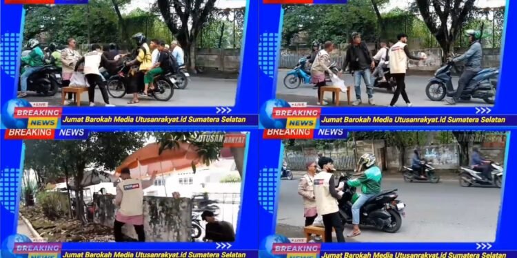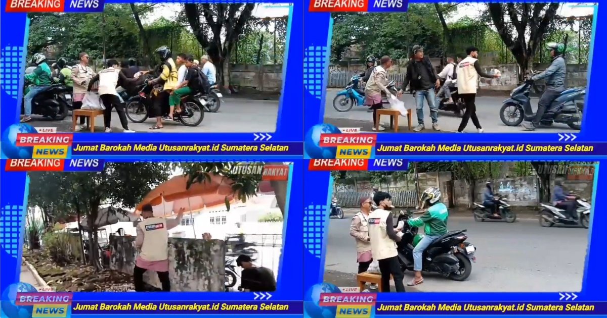 Gambar: Suasana kegiatan sosial “Jumat Barokah” yang diadakan oleh media utusanrakyat.id di depan kantor perwakilan Sumatera Selatan. Terlihat tim sedang membagikan bungkusan makanan kepada para pengendara ojek online dan masyarakat sekitar yang melintas.