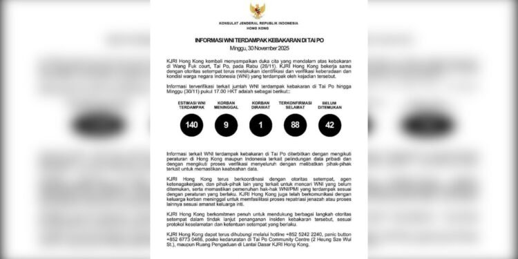 Gambar: Sebuah infografis resmi yang dirilis oleh Konsulat Jenderal Republik Indonesia di Hong Kong tertanggal Minggu, 30 November 2025, menampilkan data terkini mengenai warga negara Indonesia yang terdampak insiden kebakaran di Wang Fuk Court, Tai Po. Gambar tersebut memuat lambang Garuda Pancasila di bagian atas dan rincian statistik korban dengan latar belakang putih, mencakup jumlah estimasi WNI terdampak sebanyak 140 orang, 9 korban meninggal, 1 dirawat, 88 terkonfirmasi selamat, dan 42 orang masih belum ditemukan, serta informasi kontak darurat KJRI Hong Kong.