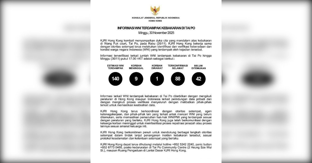 Informasi terverifikasi terkait jumlah WNI terdampak kebakaran di Tai Po hingga Minggu (30/11) pukul 17.00 HKT adalah sebagai berikut: