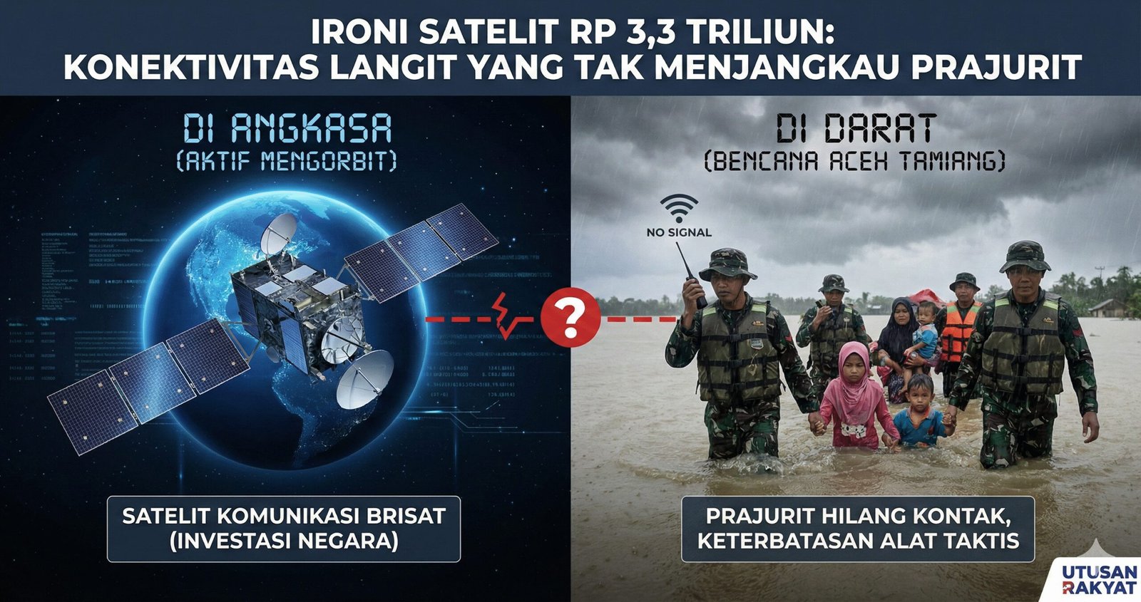 JAKARTA (Utusan Rakyat) – Insiden hilangnya kontak dengan sejumlah personel TNI selama lima hari di tengah bencana banjir Aceh Tamiang memicu pertanyaan mendasar mengenai efektivitas infrastruktur komunikasi pertahanan negara. Peristiwa ini menyoroti kesenjangan tajam antara keberadaan satelit BRIsat senilai Rp 3,375 triliun yang mengorbit aktif di angkasa dengan keterbatasan peralatan taktis yang dipegang prajurit di lapangan.