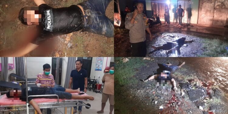 Gambar: Kolase foto yang menunjukkan proses evakuasi dan identifikasi korban pembunuhan di Desa Penawar Rejo, Kecamatan Banjar Margo. Tampak aparat kepolisian sedang melakukan olah tempat kejadian perkara (TKP) di lokasi penemuan jenazah pada malam hari.