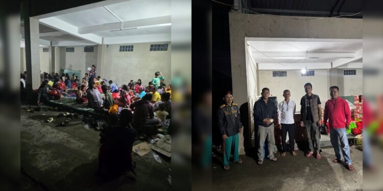 Gambar: Kolase foto memperlihatkan suasana warga terdampak banjir yang sedang mengungsi dan beristirahat di sebuah aula penampungan sementara (kiri), serta Anggota DPRD Kota Cilegon Jansen Hilarius Napitupulu bersama tim saat menyerahkan bantuan logistik di lokasi terdampak banjir di Lingkungan Kranggot pada malam hari (kanan).