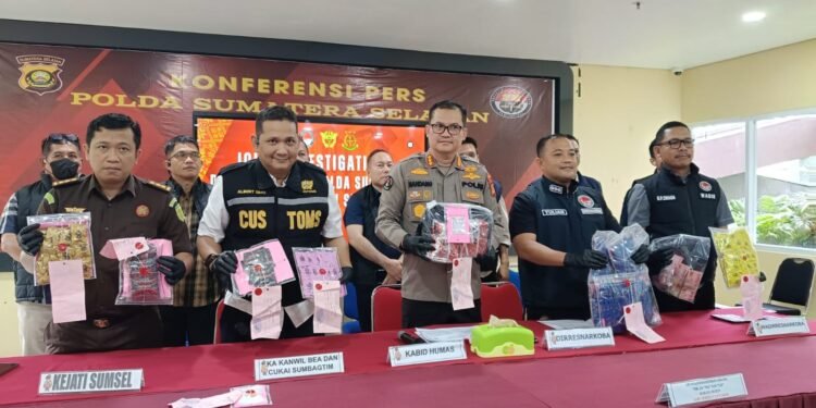 Gambar: Aparat gabungan dari Polda Sumatra Selatan, Kanwil Bea Cukai Sumbagtim, dan Kejati Sumsel menunjukkan barang bukti narkotika dalam acara konferensi pers di Palembang. Petugas memperlihatkan ratusan kemasan cartridge berisi cairan Etomidate serta sabu dalam bungkus teh Cina merek Guan Yin Wang yang disita dari jaringan pengedar lintas provinsi. Foto ini menampilkan para pejabat utama termasuk Kabid Humas Kombes Pol Nandang Wijaya Mukmin dan Dirresnarkoba Kombes Pol Yulian Perdana yang memaparkan detail modus baru peredaran narkoba terselubung di wilayah Sumatra Selatan.