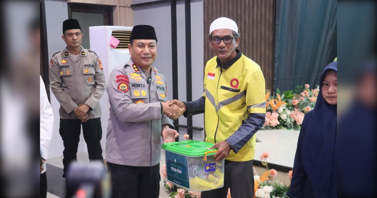 Gambar: Kapolda Riau Irjen Pol Herry Heryawan menyerahkan bantuan sosial berupa bingkisan kepada salah satu warga yang mewakili komunitas pengemudi ojek online (ojol) dalam rangkaian kegiatan Safari Ramadan di Dumai, disaksikan jajaran pejabat kepolisian dan warga, Rabu (25/2/2026).
