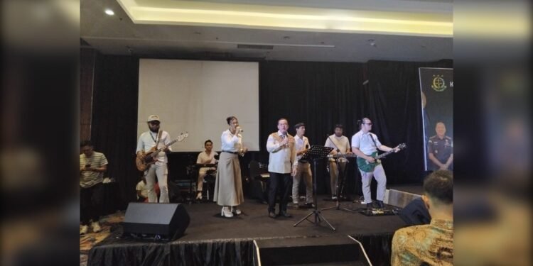 Gambar: Kapolrestabes Palembang, Kombes Pol. Dr. Haryo Sugihartono, S.I.K., M.H., saat menyumbangkan suara emasnya diiringi grup musik dalam acara pisah sambut Kepala Kejaksaan Negeri (Kajari) Palembang di Hotel Arista Palembang, Senin (3/11/2025) malam.