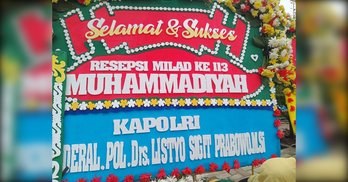 Gambar: Karangan bunga ucapan selamat dan sukses untuk Resepsi Milad ke-113 Muhammadiyah. Ucapan tersebut dikirimkan oleh Kapolri Jenderal Pol. Drs. Listyo Sigit Prabowo, M.Si., sebagai bentuk apresiasi dan dukungan.