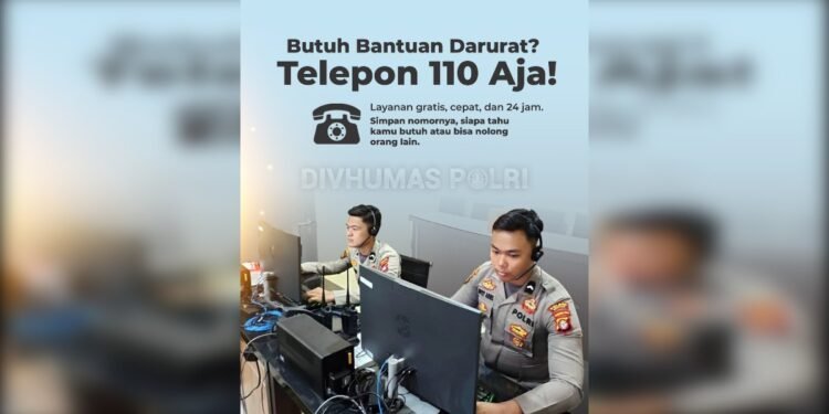 Gambar: Ilustrasi poster layanan darurat Polri 110 yang menampilkan dua petugas operator kepolisian sedang bertugas di depan komputer dengan perangkat headset, disertai teks ajakan untuk menghubungi nomor 110 yang aktif 24 jam, gratis, dan cepat sebagai bagian dari sosialisasi keamanan Divhumas Polri.