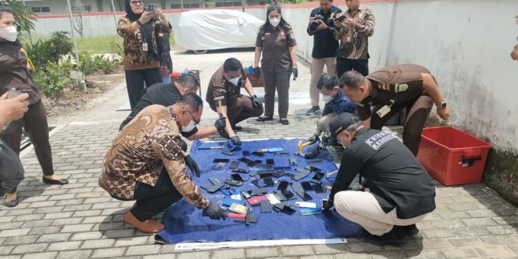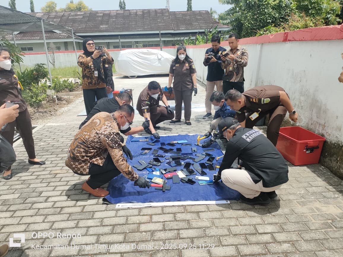 Gambar: Sejumlah petugas dari Kejaksaan Negeri Dumai bersama perwakilan instansi terkait memusnahkan barang bukti berupa puluhan telepon genggam dengan cara dirusak menggunakan palu di halaman kantor Kejari Dumai, Kamis (25/9/2025). Pemusnahan ini merupakan bagian dari penegakan hukum terhadap berbagai tindak pidana umum yang perkaranya telah berkekuatan hukum tetap.