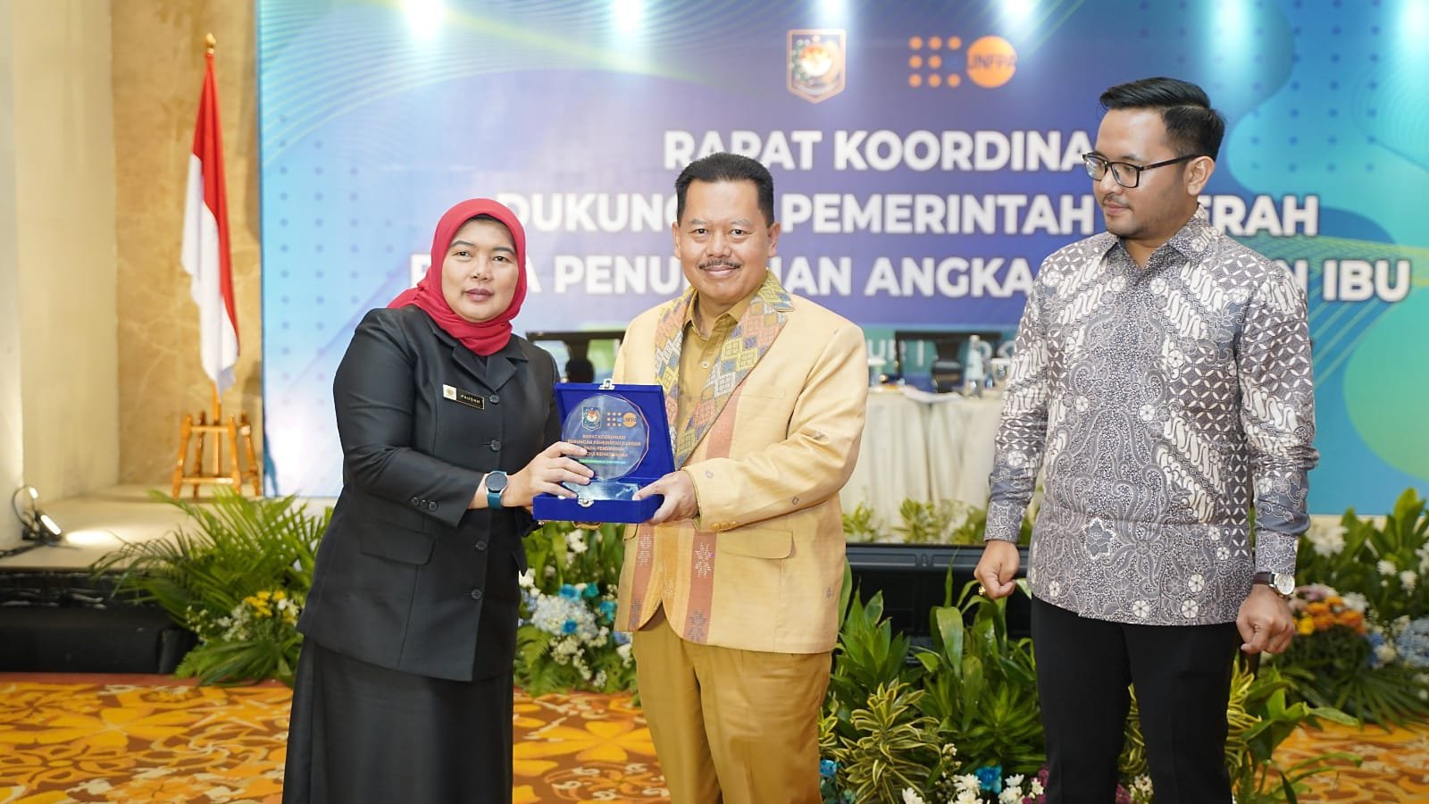 Gambar: Direktur Sinkronisasi Urusan Pemerintahan Daerah IV Kemendagri, Paudah (kiri), menerima plakat dalam Rapat Koordinasi Dukungan Pemerintah Daerah pada Penurunan Angka Kematian Ibu di Hotel Borobudur, Jakarta, Selasa (21/10/2025). Acara ini menekankan penguatan peran Tim Penggerak PKK sebagai bagian dari strategi nasional untuk menekan Angka Kematian Ibu (AKI) di Indonesia.