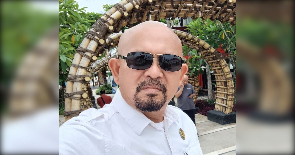 Gambar: Komisioner Komisi Informasi Provinsi Riau Bidang Advokasi Sosialisasi dan Edukasi, H. Zufra Irwan, S.E., M.M., CMed., SpAp., yang juga menjabat sebagai Ketua Dewan Kehormatan PWI Riau, berpose di lokasi dengan latar belakang struktur bambu dekoratif.