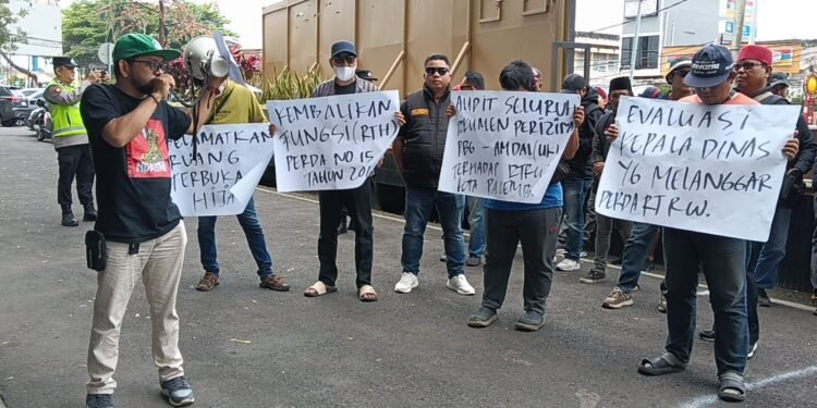 Gambar: Sejumlah massa dari Gabungan Koalisi Organisasi Pergerakan Kota Palembang melakukan aksi unjuk rasa di depan sebuah area proyek dengan membawa beberapa poster tuntutan. Poster-poster tersebut berisi desakan untuk menyelamatkan Ruang Terbuka Hijau (RTH) sesuai Perda Nomor 15 Tahun 2018, menuntut audit dokumen perizinan PBG-AMDAL terkait RTRW Kota Palembang, serta meminta evaluasi terhadap Kepala Dinas yang dianggap melanggar aturan. Seorang orator yang mengenakan kaos hitam dan topi hijau terlihat sedang menyampaikan aspirasi menggunakan pengeras suara di hadapan petugas kepolisian dan peserta aksi lainnya.