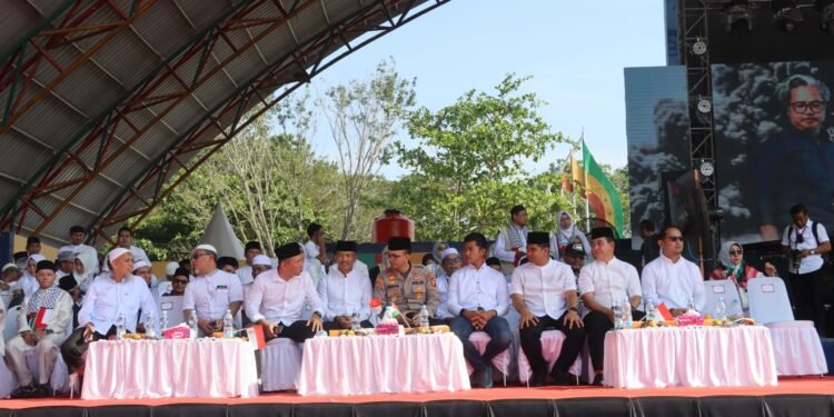 Gambar: Wali Kota Dumai H. Paisal bersama Kapolres Dumai AKBP Angga Febrian Herlambang dan jajaran Forkopimda duduk bersama di atas panggung utama dalam acara Konser Kemanusiaan untuk Sumatera dan Palestina di Taman Bukit Gelanggang, Sabtu (24/1/2026). Para pejabat tampak mengenakan busana muslim putih dan seragam dinas di bawah naungan tenda lengkung besar dengan latar belakang layar digital yang menampilkan visual aksi kemanusiaan.