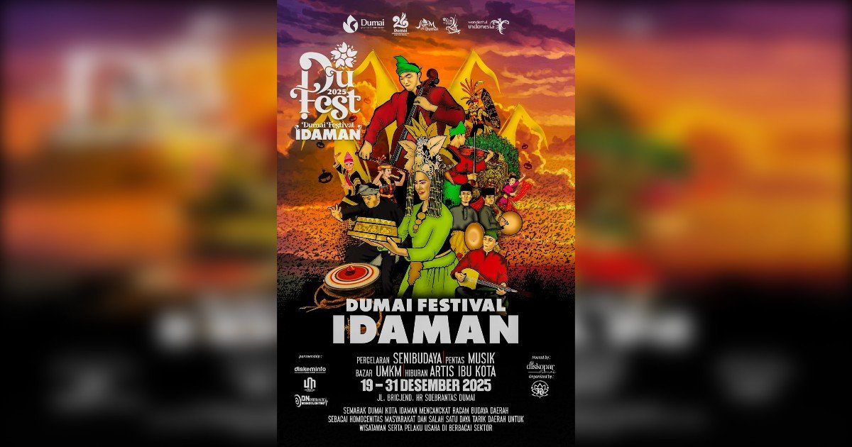 Gambar: Poster digital acara “Du Fest 2025: Dumai Festival Idaman” yang bernuansa jingga kemerahan dengan ilustrasi penari tradisional dan musisi Melayu. Poster mencantumkan informasi waktu pelaksanaan 19-31 Desember 2025 dan lokasi di Jalan Brigjend HR Soebrantas, Dumai, yang menjadi tempat penyelenggaraan berbagai kegiatan termasuk konser musik dan bazar UMKM yang relevan dengan lokasi kegiatan amal yang diberitakan.