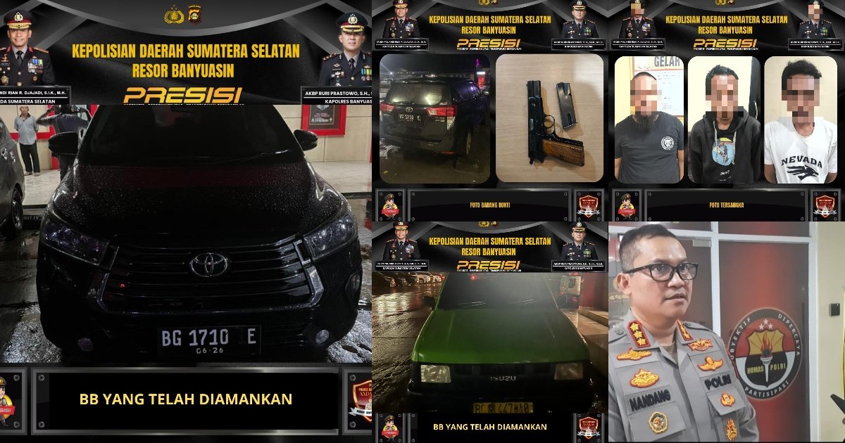 Gambar: Kepolisian Resor Banyuasin menunjukkan barang bukti dan para tersangka dalam kasus penembakan di Jalan Lintas Palembang–Betung. Barang bukti yang diamankan mencakup mobil Toyota Innova Reborn hitam, angkutan umum hijau, dan sepucuk senjata api jenis FN, serta tiga tersangka berinisial HS, IG, dan DSP yang wajahnya disamarkan.